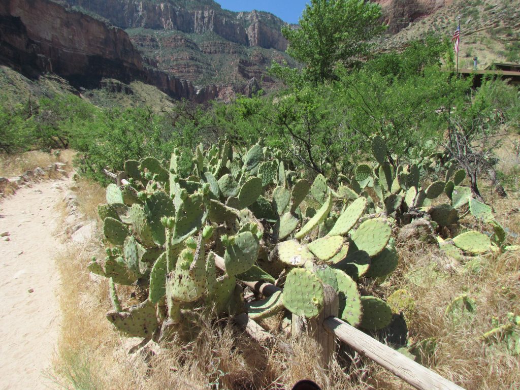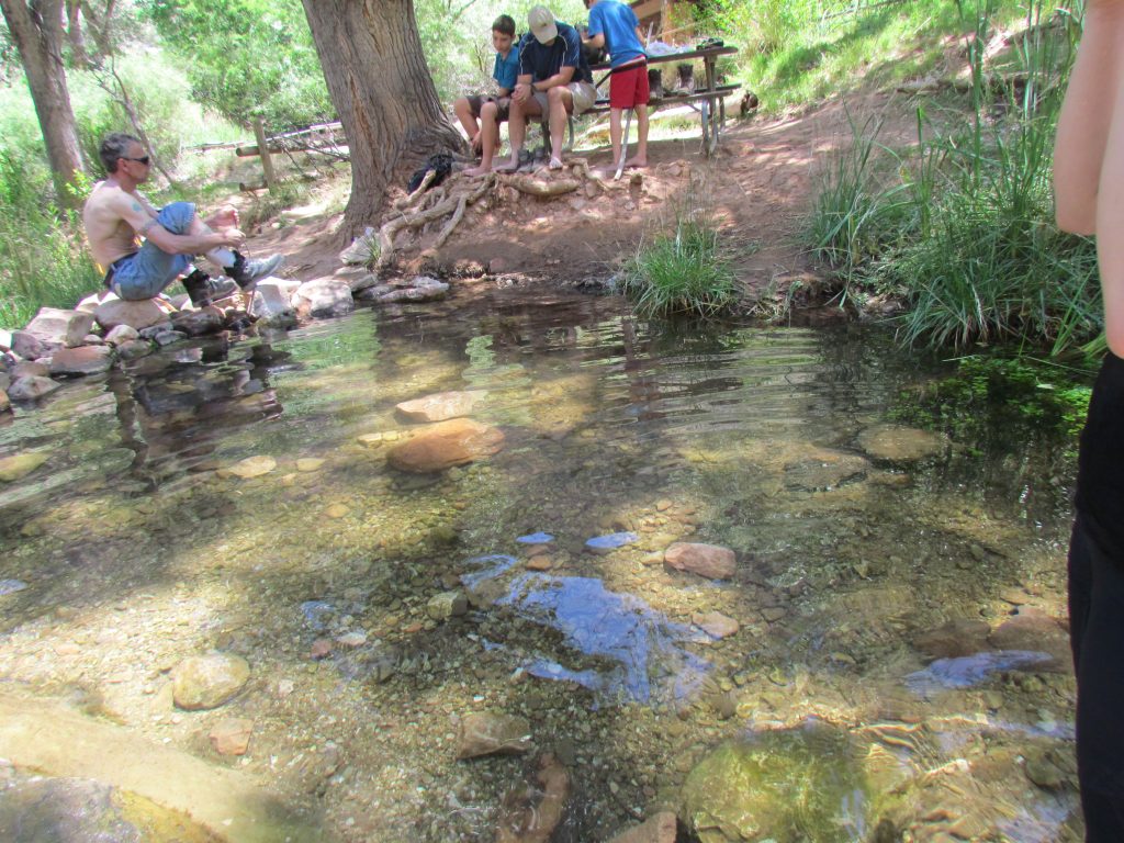 Kurz vorm Indian Garden kam uns eine Rangerin entgegen die uns darauf aufmerksam machte, dass wir uns immer mal wieder Wasser über Kopf und Körper kippen sollten bei der Hitze. Außerdem würde ein kleiner aufgestauter See auf uns am nächsten Rastpunkt warten wo wir einmal mit der Kleidung reingehen können. Das ließen wir uns nicht zweimal sagen und steuerten gradewegs darauf zu.
