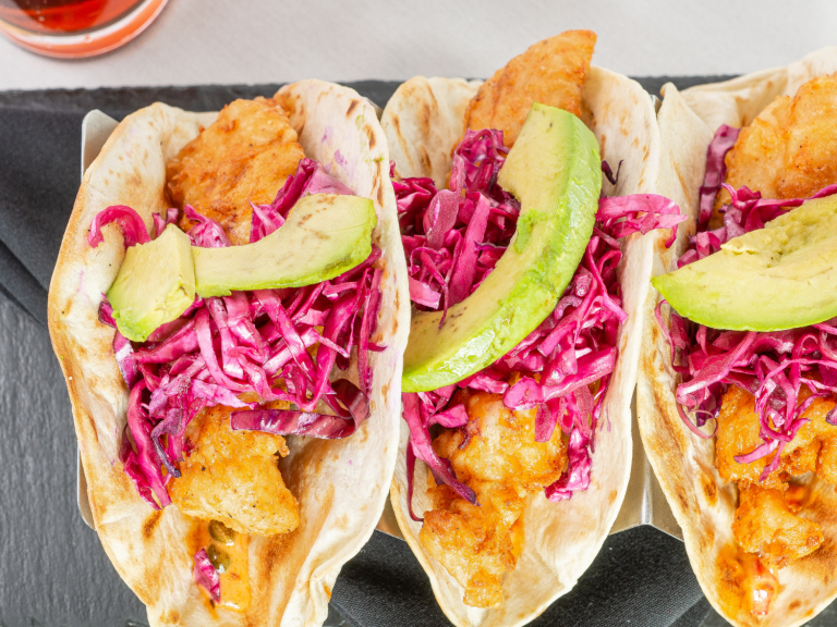 Frischer Fisch wird knusprig frittiert oder gegrillt und in einer Tortilla mit Kohl, Salsa und Limette serviert.